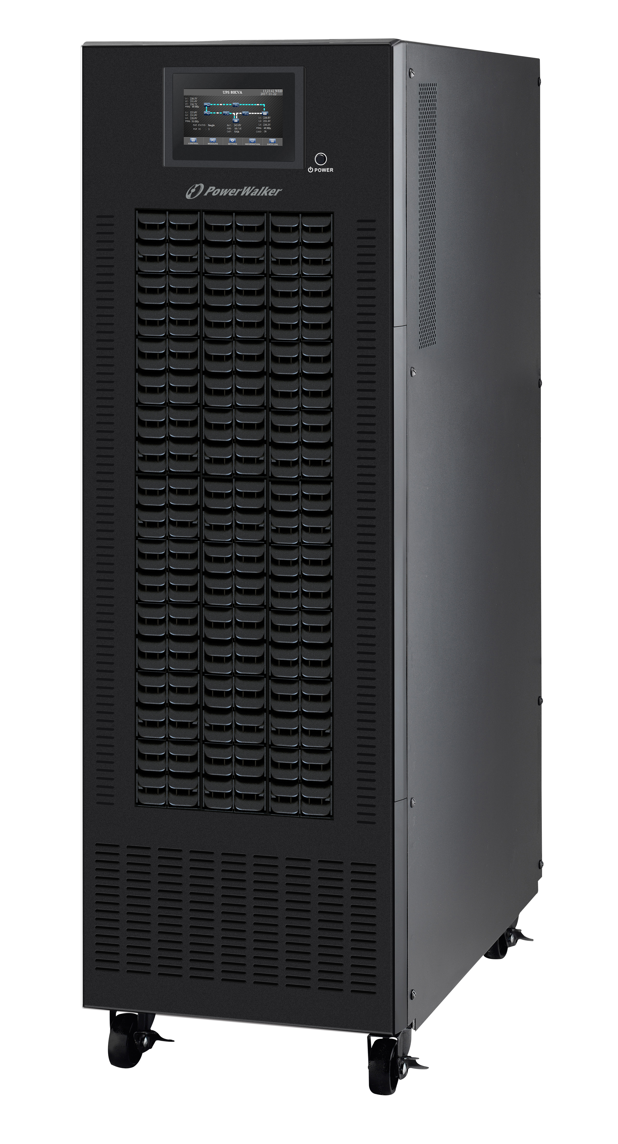 The PowerWalker VFI CPG 3/3 PF1 series is a professional commercial solution built in double conversion technology with power factor 1.0. Equipped with three-level inverter topology, it results in high efficiency reaching 95.5% in Line Mode and even 98.5% in ECO Mode. The series ensures low harmonic distortions and precise voltage regulation (1%). All phases have Active Power Factor Correction.